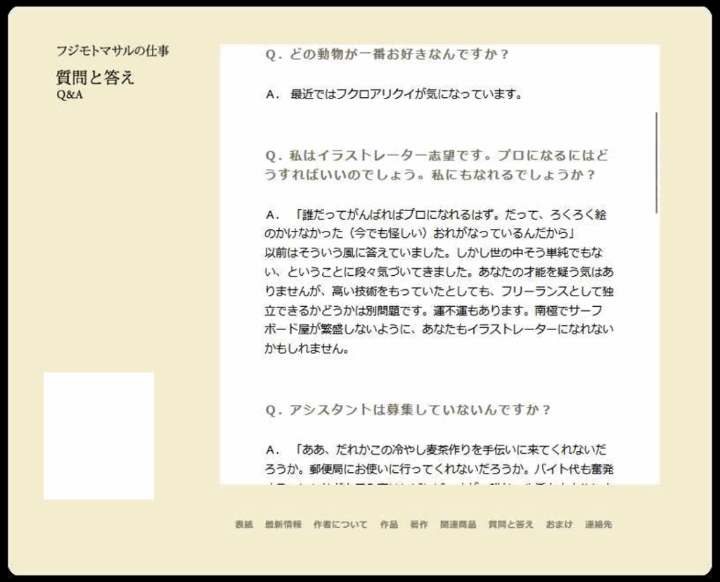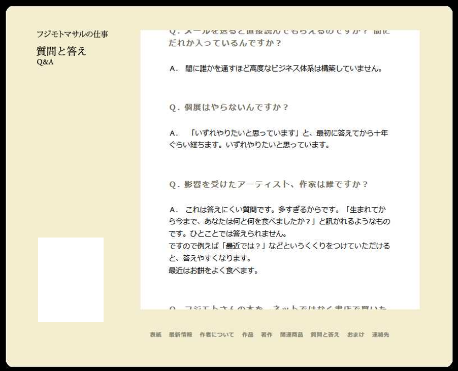 このページ「質問と答え<Q&A>」では、ファンの方々の質問にフジモトマサルさんが答える形式になっています。